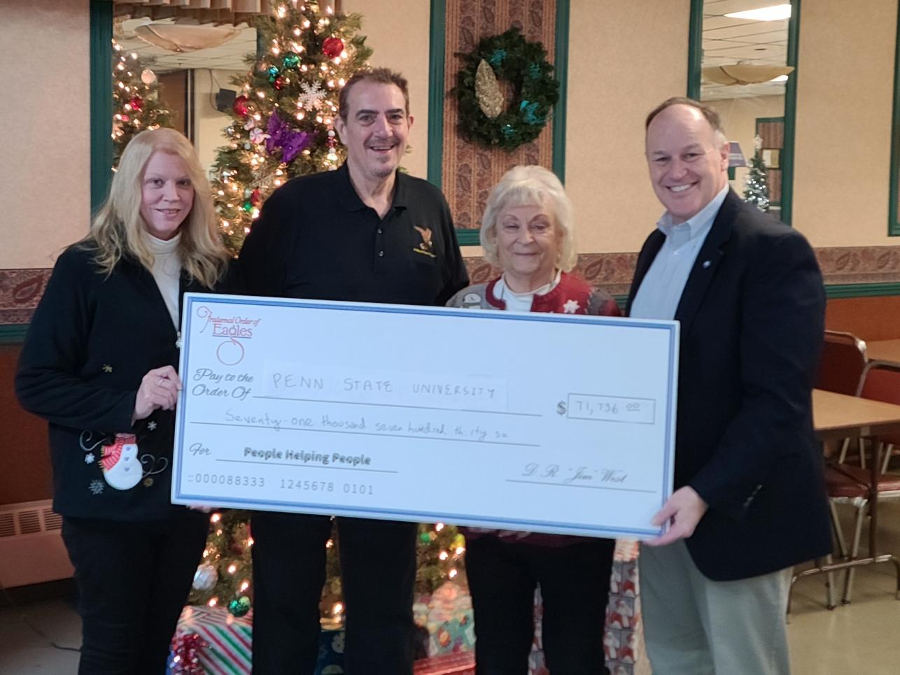 The Aerie and Auxiliary #1299 presented Penn State University $71736 in combined local and PA state grants to benefitState Grants: Alzheimer- $10000; Diabetes- $10000; Heart- $10000; Kidney- $10000; Muscular Dystrophy- $5000; Spinal Cord- $15000—-Total $60000Auxiliary and Aerie donation combined- $11736Pictured are: Tammy Fisher, Aux Treasurer; Mark Bahr -Aerie Secretary; Elaine Regi- Aux Secretary, PGMW; and Zane Gizzi-Penn State College of Medicine